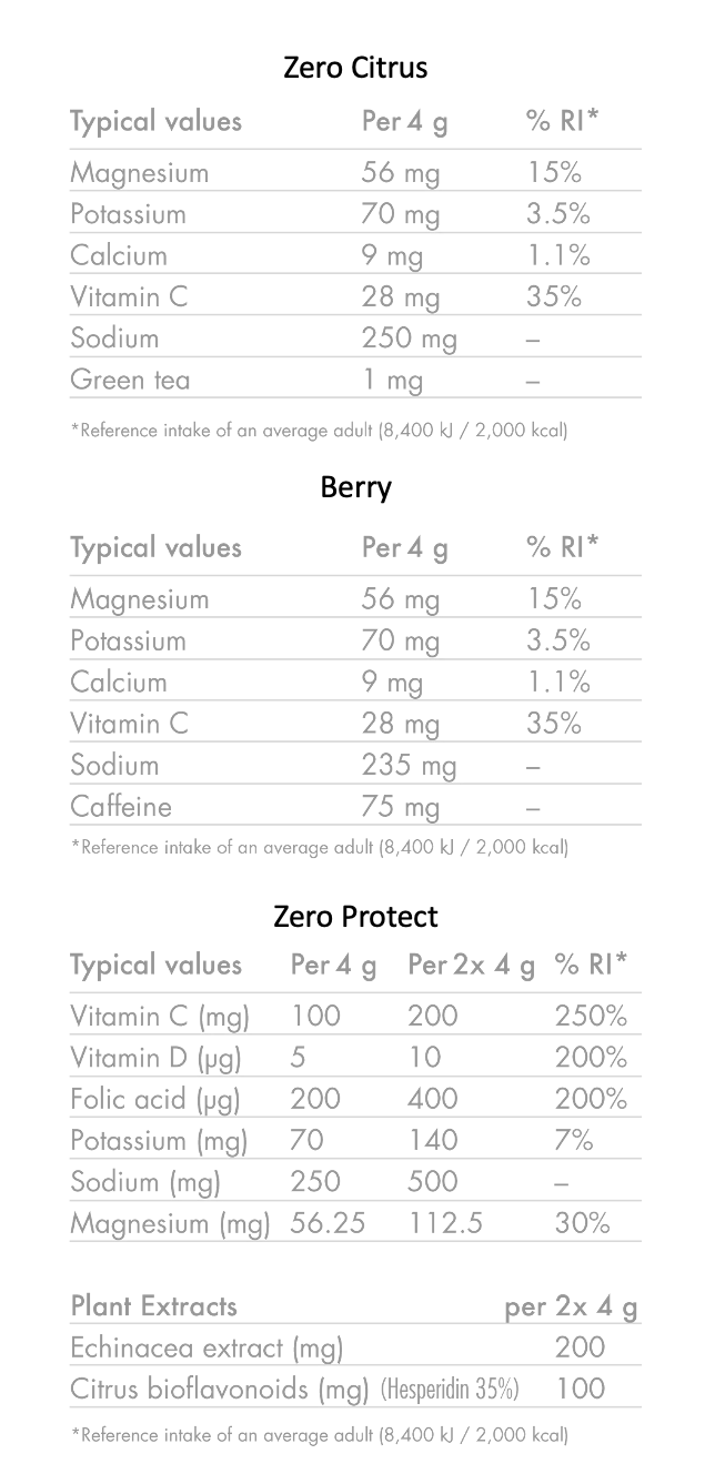 ZERO: The original hydration tablet for sport. A light and refreshing sugar free electrolyte drink with zero calories that makes staying hydrated easy. Packed with electrolytes, like sodium, potassium and magnesium, ZERO gives you what water can’t.